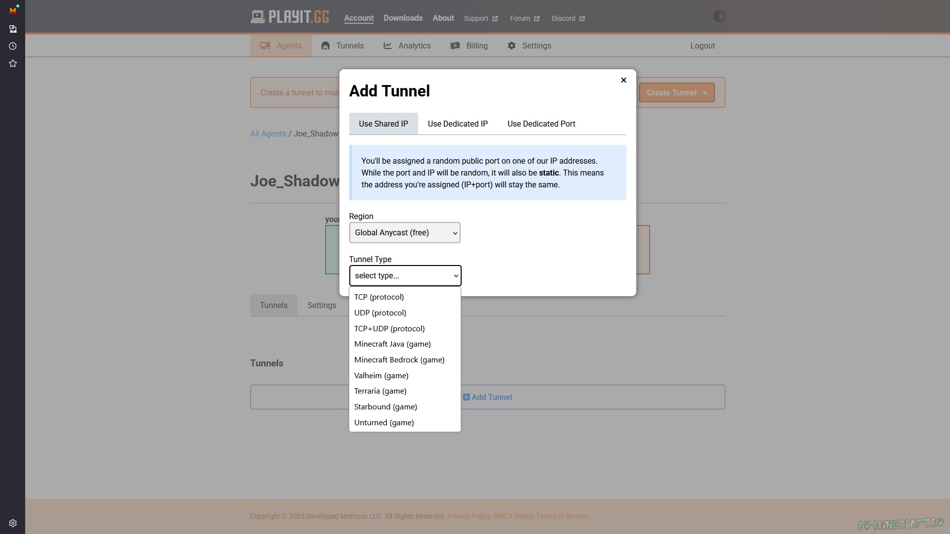 Меняем имя агента на ваше, и завершаем подключениеВ личном кабинете появится окно с выбором местоположения хоста и выбор типа туннелирования. Среди тунелей можем выбрать как TCP, UTP, если вы знаете что это такое, или уже готовые пресеты к определенным играм.