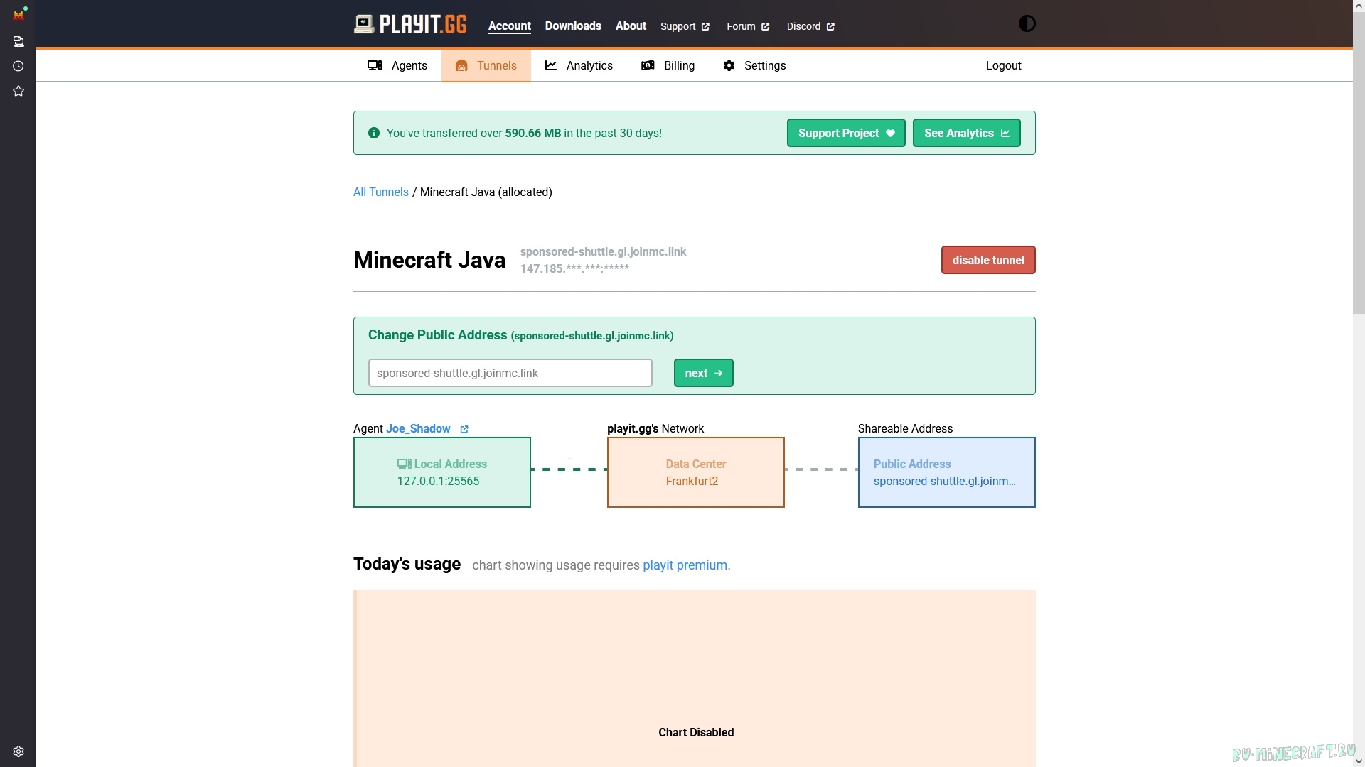 На данном этапе, мы уже можем запустить свой сервер по Minecraft, и на нём играть с друзьями.Окно где можно видеть местоположение туннеля и собственно сам IP адрес сервиса (как пример на фото: 147.185.***.***:*****) (меньше знаем, крепче спим)