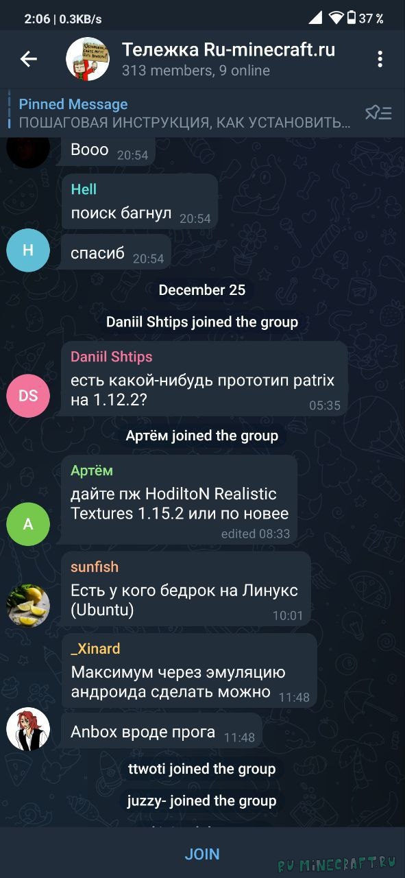 Телеграмм-канал румине, если так можно сказать, полностью отпочковался от оригинального сайта. На самом канале просто делается перепост новостей (предположительно, с помощью бота), а в группе этого канала творится поистине странное действо. Его модерирует отдельный человек, обсуждают там в основном шейдеры, графику, технику и также совершенно несвязанные с майнкрафтом и тем более с румине вещи. Интересная там экосистема...
