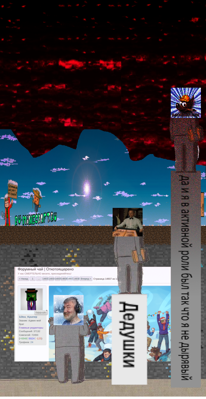 5 0 0 0: Ну здесь можно дико размахнуться. (Жердн любезно предоставило нам архив, просмотреть который вы можете здесь.) У меня, собственно, на съемном диске хранятся всякие рандомные сохраненные вещи еще с 2013 года, конечно, в сильно разных количествах, и в основном просто несвязные юмористические поделки. Тут и что-то по мелочи реально из 2013, и что-то из ватафака и эпохи вк-конф, и 2016, праймовые гопник-телевидение-времена, и чудеса урандома с миллиардом всяких карт от Роберта и меня, и так далее. Ну и мелочью что-то по дискордам тоже. Я благо всегда архивировало все после каждой переустановки винды - папку мои документы в первую очередь (в которой у меня обычно все набито и 3478347 названий "равыоарво.png"), и дальше всякие скрины кубов и стима мб.