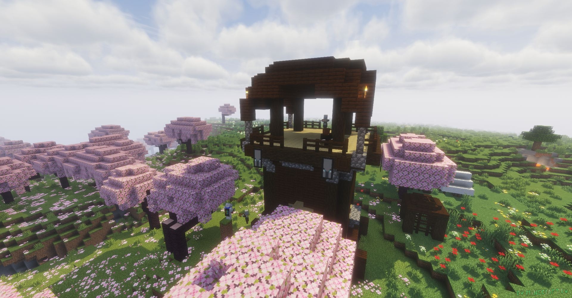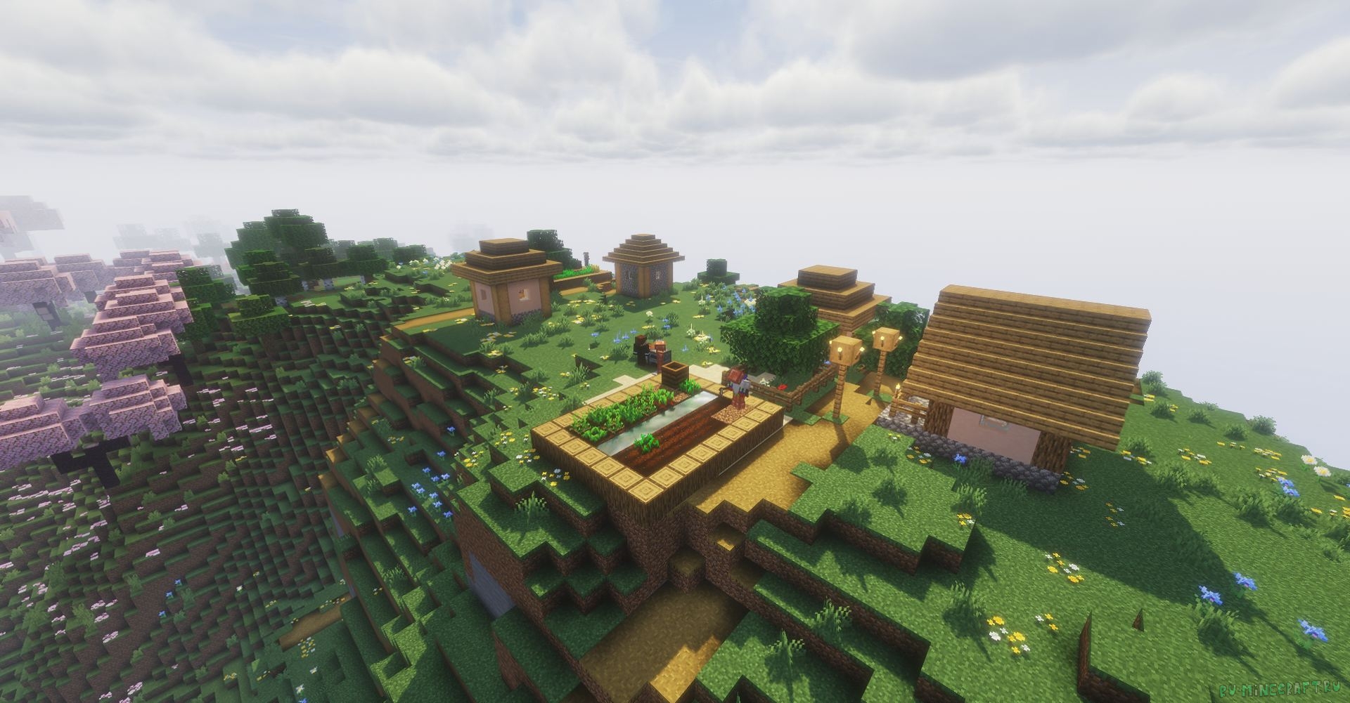 Чуть подальше отсюда, на координатах -149 131 -414 расположилась главная достопримечательность этой карты: деревня на горе. Она находится рядом с вишнёвым биомом. Также около неё будет разрушенный портал.