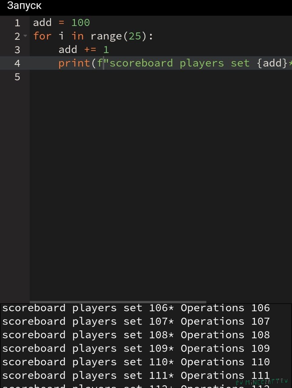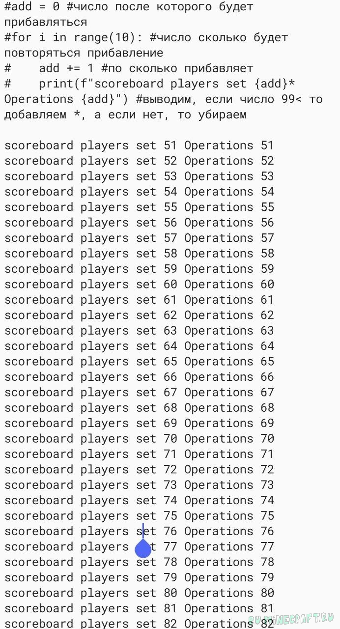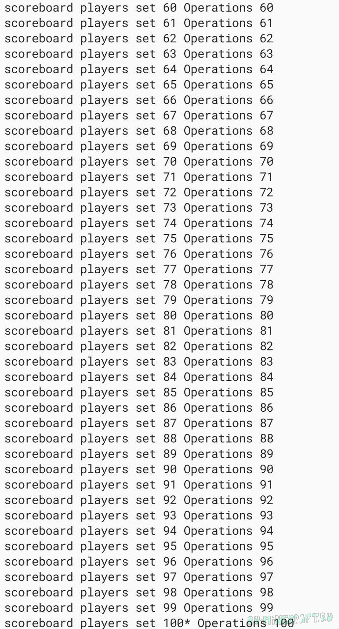Numbers при загрузке в мир в скорборд Operations игрокам 3 4 ... 99 100* поставит 3 4 ... 99 100 очков соответственно. Так вы сможете считать /scoreboard players operations игрок скорборд /= 2 Operations, или другие любые числа. Чтоб увеличить количество чисел используйте python код в комментарии файла load в дата-паке. Код вставьте в любой исполнитель пайтона и уберите первые комментарии. Настраивать его по инструкции