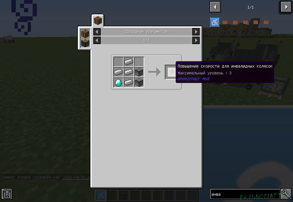 Небольшой мод от китайского разработчика привнесет в игру нововведение в виде инвалидной коляски. Данный мод добавит в игру возможность скрафтить инвалидную коляску, и сделать стива инвалидом, у инвалидного кресла так сказать, много функций, можно сделать улучшение на высоту прыжка, скорости и т.д. Мод отлично подойдёт если хотите чтобы дракона победил инвалидированный стив...