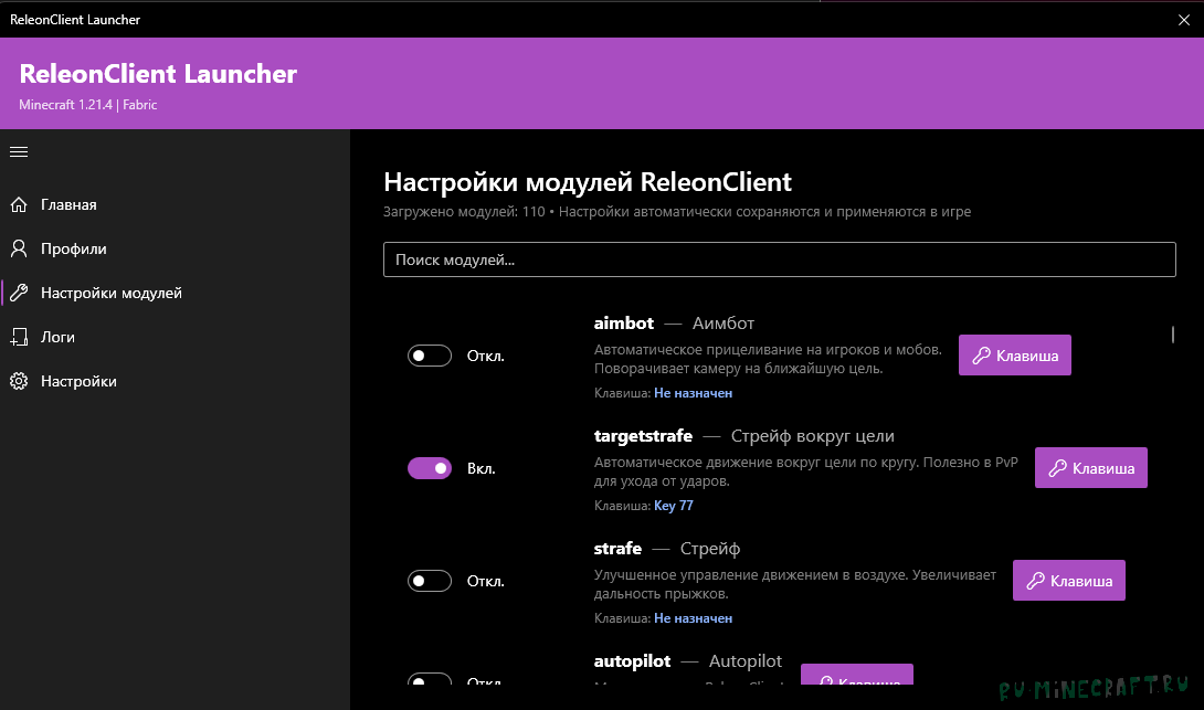 Ключевые слова:читы для майнкрафт, читы minecraft 1.21.4, чит клиент майнкрафт, чит клиент fabric, minecraft fabric cheat client, pvp клиент minecraft, xray minecraft, esp minecraft, killaura minecraft, autototem minecraft, читы для анархии, читы для серверов майнкрафт, ReleonClient Launcher v1.3.