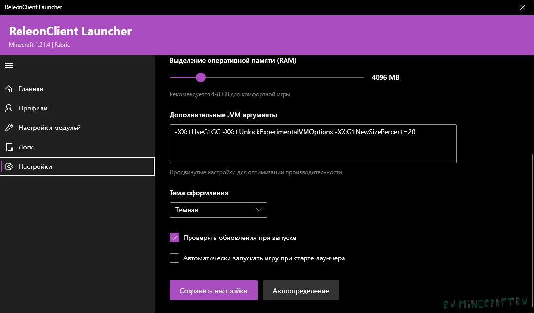 Основные возможности ReleonClient Launcher- Автоматическая установка клиента в папку .minecraft/mods