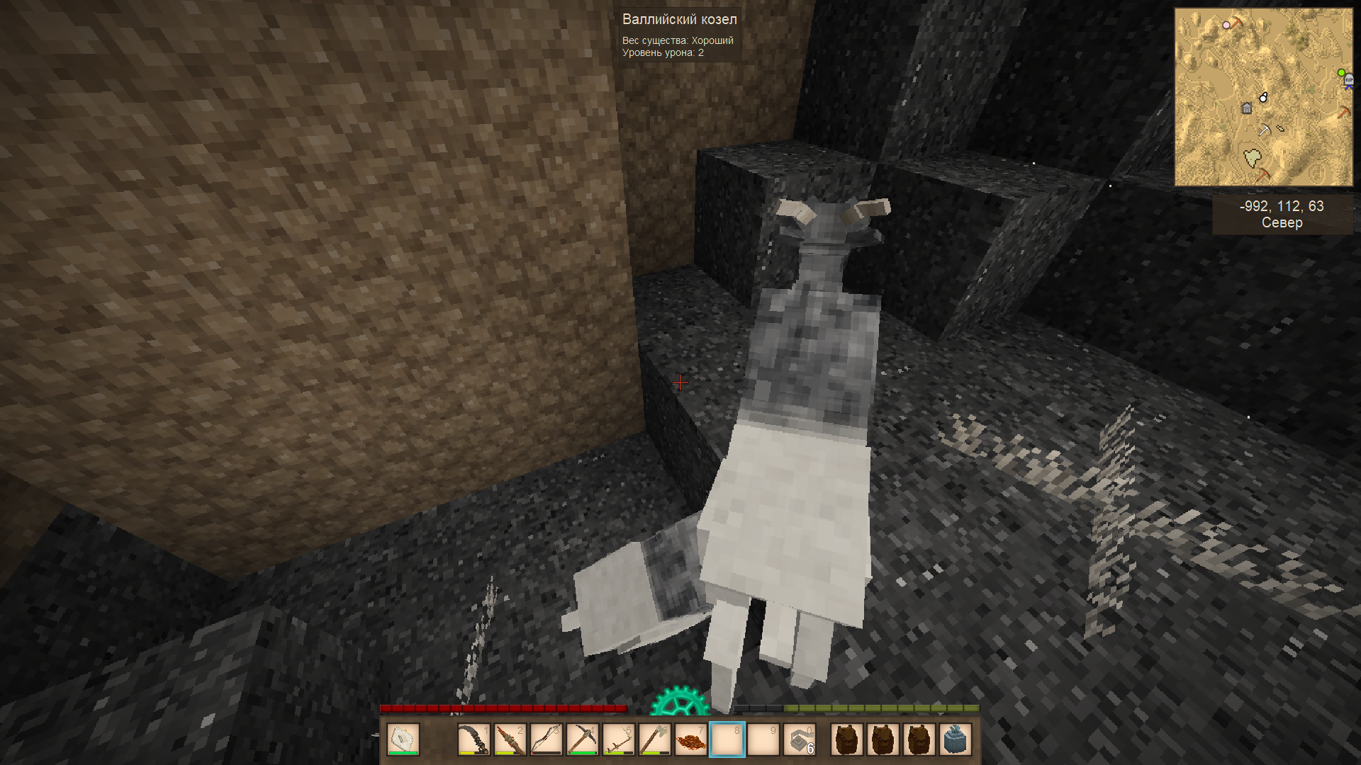 Но спустя несколько часов мучений и погибших коз, которых угораздило сигануть в пещеру, у меня получилось загнать одного козла и козу, хоть и довольно далеко от дома. Ну зерна у меня много и я просто его оставил в кормушкам им. Тут не получилось заскриншотить, что коза уже беременная - настолько они быстрые и бешеные.