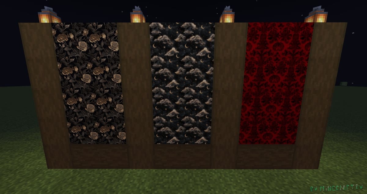 Мод добавит в майнкрафт блоки с повторяющейся текстурой, в целом они просто похожи на обои с красивым паттерном в виде цветов и других вещей. Отлично подойдет для придания комнате уникальности + в целом это выглядит необычно и красиво. А вообще это похоже на дамаст, что олицетворяет издревле роскошь и богатство.