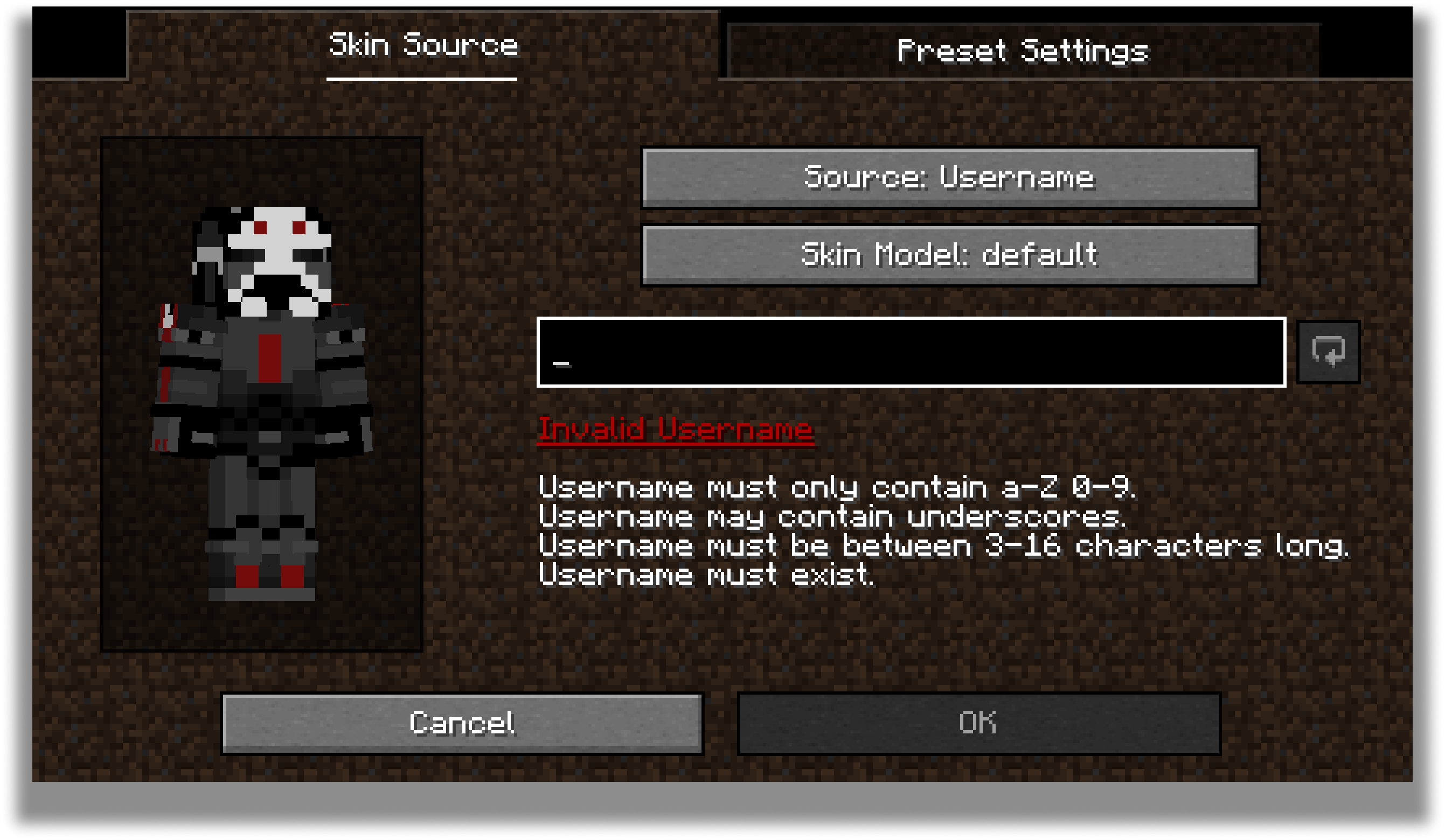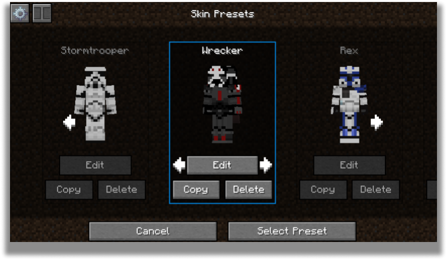 Настройка: Вы можете изменить фактическую текстуру скина, его тип модели (классический или тонкий) и название пресета.