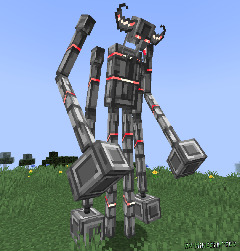 Мод добавит в майнкрафт нового босса, который будет появляться в последних двух волнах рейда. Выглядит он как робот с длинными ногами и еще более длинными руками, а точнее двумя парами рук, которые левитируют рядом с его телом, этими руками он наносит поситине огромный урон. У него несколько видов атак и он умеет телепортироваться.