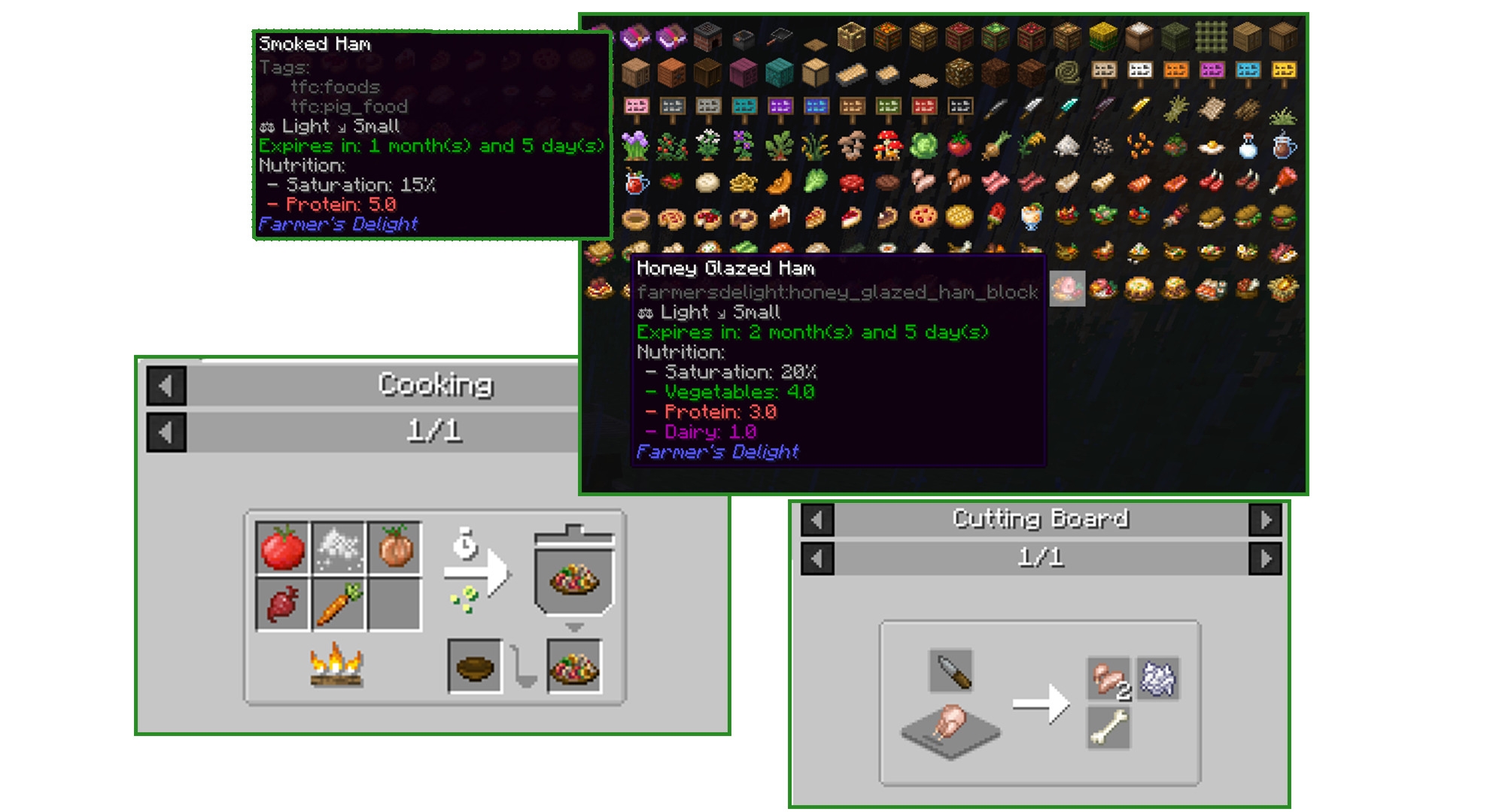 Farmer's Delight TFC - мод представляет собой адаптацию Farmers Delight к миру TerraFirmaCraft, полностью интегрируя обе системы. Он добавляет рецепты, использующие ресурсы TFC — овощи, фрукты, мясо и другие продукты — в кастрюле Farmers Delight, применяет систему порчи продуктов из TFC ко всем блюдам, а также распределяет питательные вещества по категориям (овощи, белки, злаки, молочные продукты, вода).