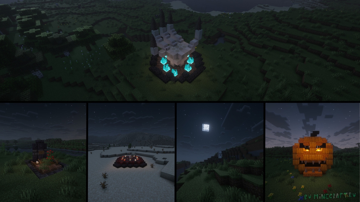 Ресурспак добавит в майнкрафт кучу криповых структур, что отлично подойдут для тематики хеллоуина. Тут и огромные тыквы, и чертёнок с горящими глазами, и пугала в полях, торчащие из земли руки с огнём, могилы и куча всего ещё - выглядит отлично, новых структур достаточно много и все они разнообразные.