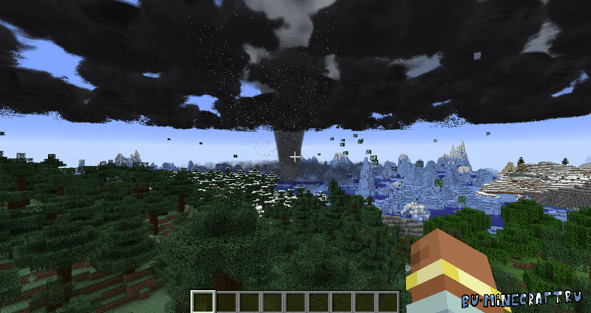 Торнадо может в верх поднять и даже воду и в результате она будет по всему миру разбросана, блоки которые подняты в воздух не просто исчезают, а приземляются в игре в другом месте. У мода крутые анимации, автор постарался и над крутыми звуками.