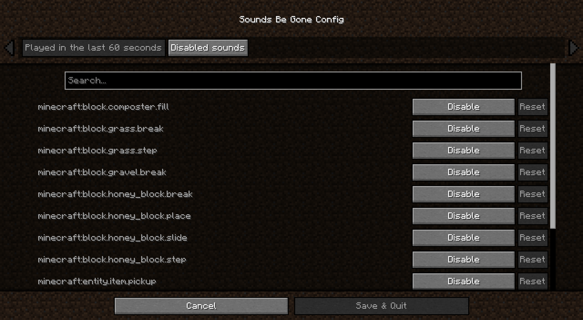 Sounds Be Gone! - мод позволяет отключить любые нежелательные звуки в Minecraft, включая стандартные, а также те, что добавляются другими модами. Особенность этого инструмента в том, что он записывает все звуки, которые игрок слышал в течение последней минуты игрового процесса, позволяя затем выбрать конкретный раздражающий звук из списка и отключить его навсегда.