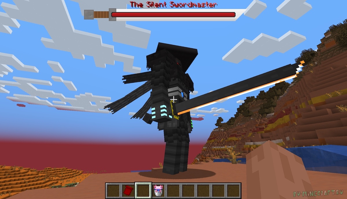 Мод добавит в майнкрафт достаточно необычного моба, который похож на самурая в киберпанк стиле. Он сделан из черного металла, у него большой меч, которым он наносит много урона за один удар. Он достаточно силен - его здоровье составляет 400 единиц, броня 12 единиц, по итогу это получается босс, с которым лучше не биться без соответствующей брони и оружия.