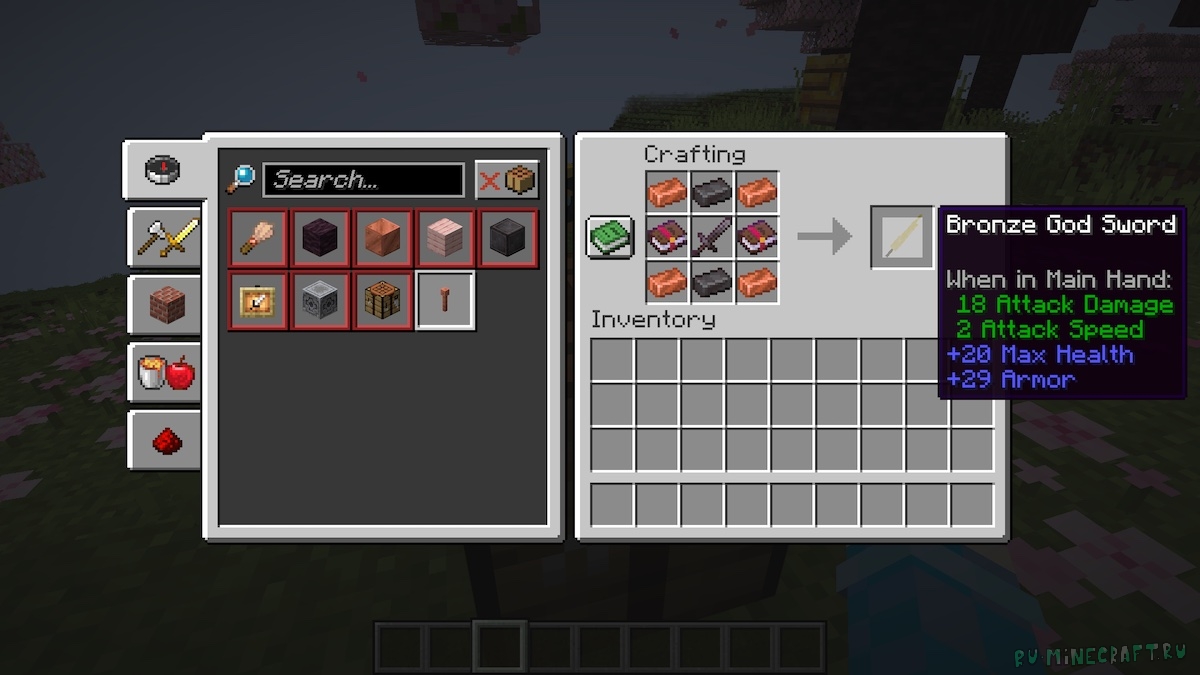 Мод добавит в майнкрафт бронзовый меч, по сравнению с остальным ванильным оружием его выгодно выделяют характеристики урона при атаке и скорости атаки, а также, что самое интересное, он дает игроку при ношении увеличение максимального здоровья 20 единиц и увеличение брони на 29 единиц, что очень полезно и обязательно пригодится игроку в долгих и сложных походах по миру игры.