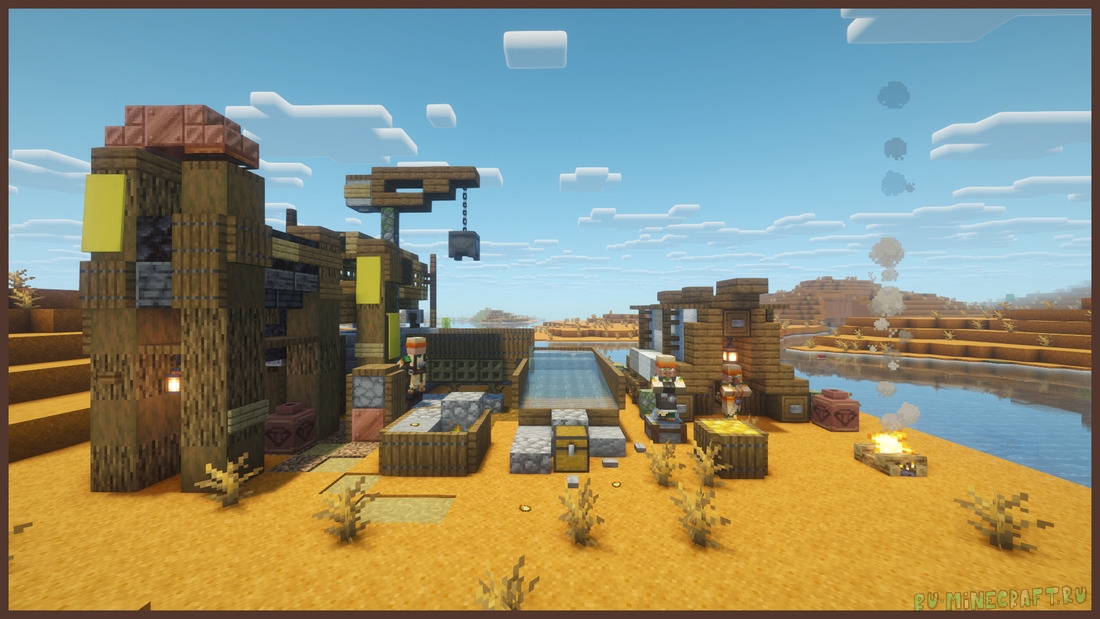 Достаточно необычное здание добавится с этим модом в майнкрафт - это несколько зданий золотоискателей, где они добывают песок, процеживают его и ищут золото. Структура будет спавниться только в пустоши, делая её гораздо более интересной для изучения. Внутри можно найти сундук с золотом и несколько спрятанных полезных блоков.