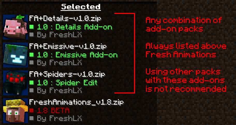 И помни, что аддон надо ставить вместе с основным ресурспаком Fresh Animations и в списке в самой игре он должен стоять выше основы: