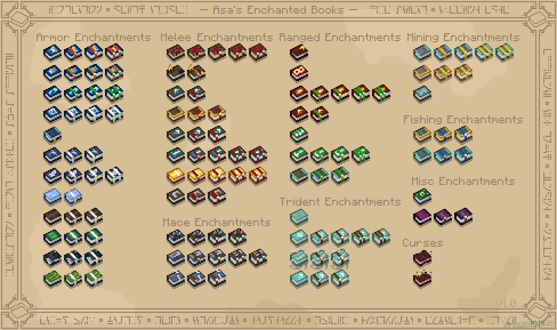 Ресурспак сделает все книжки в игре с зачарованиями уникальными - каждая книжка будет иметь свой определенный внешний вид, из-за чего можно будет легко определить какое именно зачарование в ней, причем даже в зависимости от уровня зачарования книжка будет выглядеть по-своему.